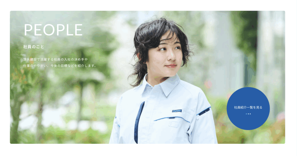 - 写真の種類:営業やじ事務、現場など様々な職種をバランスよく配置。女性の現場員の写真も多めに配置することで、女性の活躍も促している