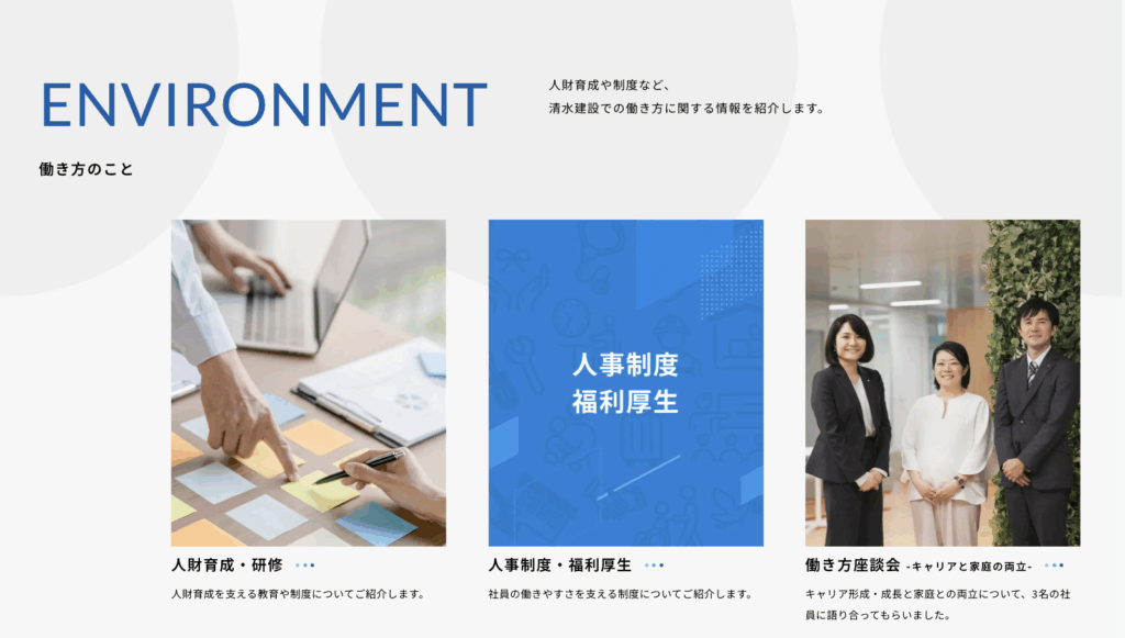 清水建設に関する事業紹介だけでなく働く人の声や働き方など、入社後の生活が詳しくわかるようなコンテンツがたくさん盛り込まれて構成されている。